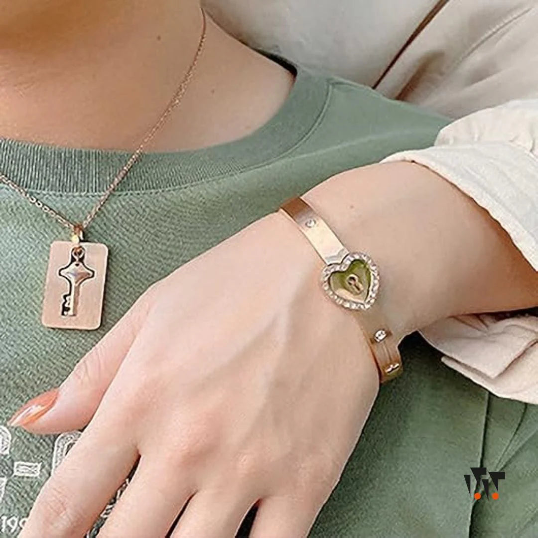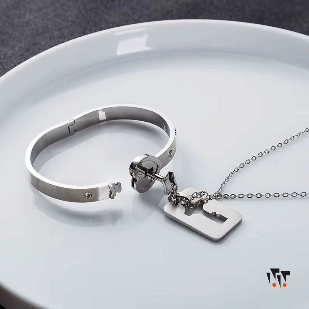 Este conjunto de joyería incluye un brazalete con un corazón que es un candado y un collar con la llave que lo abre. Representa el amor y la conexión especial entre dos personas, siendo el regalo perfecto para parejas.