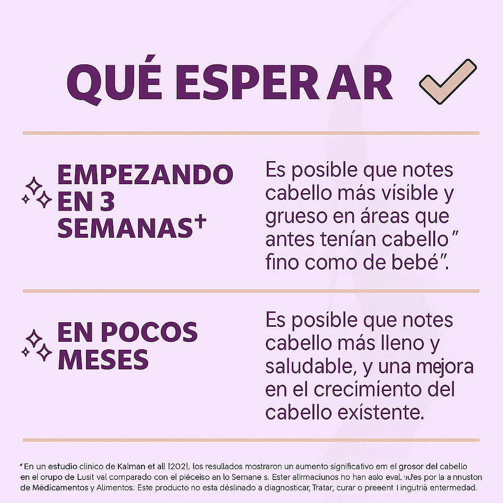 Cada persona es diferente, pero los estudios con el ingrediente Lustriva® muestran mejoras en la apariencia del grosor del cabello en pocas semanas de uso constante. Lo ideal es consumir las gomitas diariamente durante al menos 2 a 3 meses para evaluar cambios visibles.