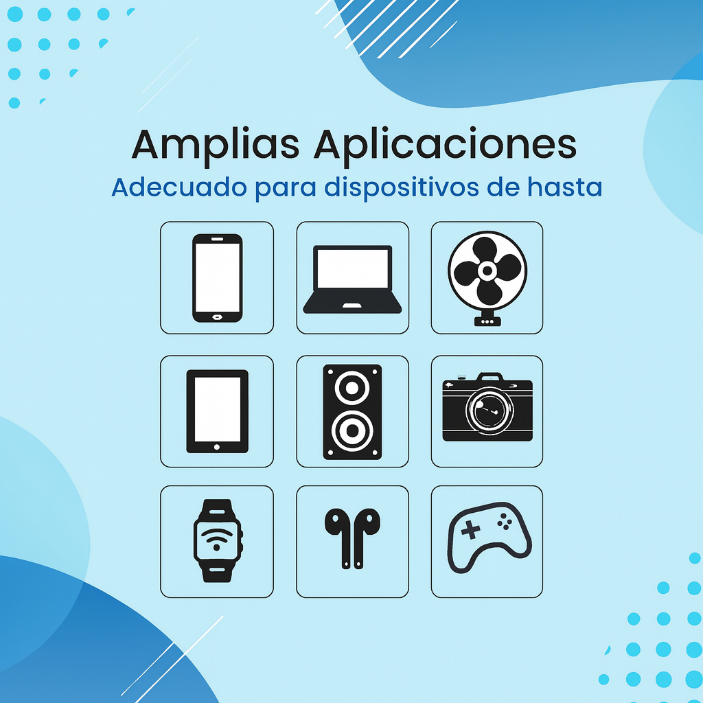 Puedes conectar equipos de bajo y mediano consumo como laptops, celulares, cámaras, parlantes, luces LED, routers o mini neveras portátiles.