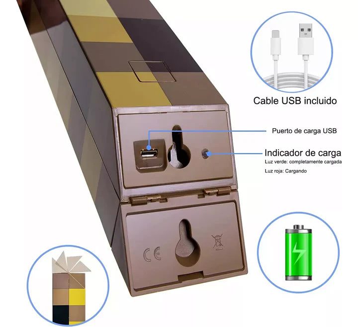 Diseñada para fans de Minecraft y amantes de la decoración gamer: 4 colores, batería recargable y diseño pixelado que fascina a grandes y chicos.