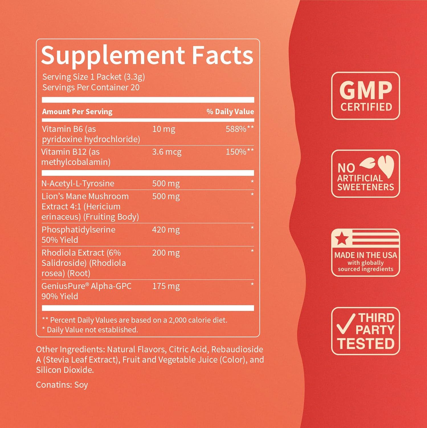 elaborado con una combinación de ingredientes funcionales que apoyan el enfoque, la claridad y la energía mental. Contiene componentes como Alpha-GPC, Melena de León, Rhodiola rosea y L-Tirosina, conocidos por su aporte a la concentración y al estado de alerta natural. No se trata de un estimulante agresivo; es una mezcla que se siente limpia y agradable.